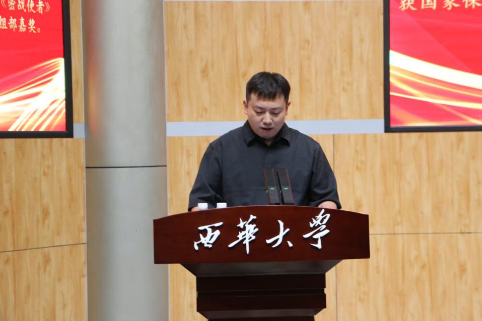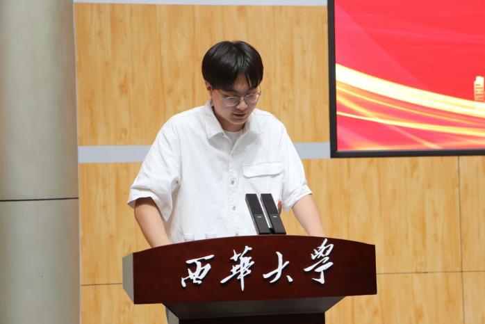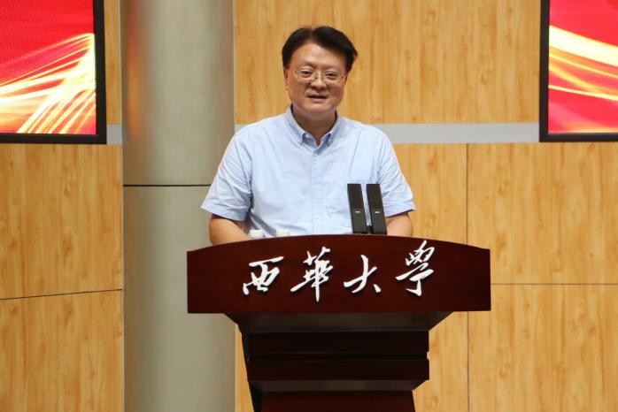 典礼尾声,文新学院院长潘殊闲发表致辞。他回顾学院50余载文脉传承历程,介绍校友在新闻、文化、教育等领域的成就,勉励新生接过“文脉接力棒”。针对新生成长需求,潘殊闲教授对新生们提出殷切希望,鼓励同学们要尽快转变角色,努力适应西华校园生活,并做好学业及人生规划,在求学路上培养体育爱好,强健体魄、保持良好心态,砥砺奋进。最后,潘殊闲院长深情寄语,希望新生在西华校园深耕细作,珍惜当下,努力奋斗,以梦为马,不负韶华。