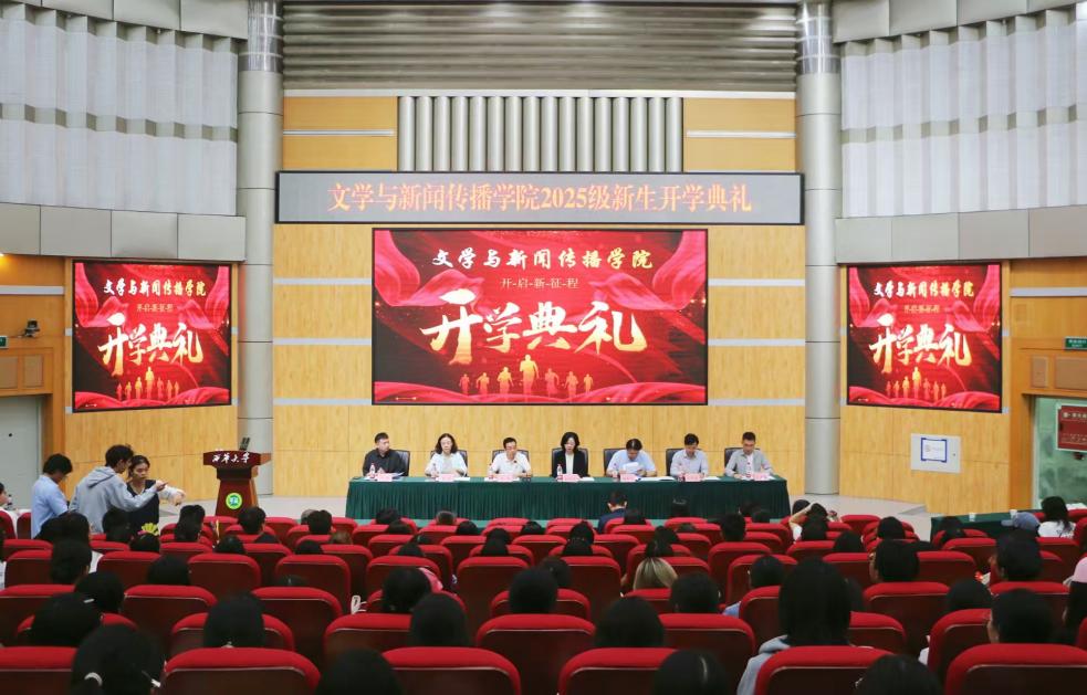 学院党委书记张雯欣、院长潘殊闲、党委副书记徐攀、副院长王学东、副院长范佳、中文系主任王燕飞、传媒系主任叶茂、新生辅导员出席典礼,2025级全体本科生、研究生参会。典礼由学院党委副书记徐攀主持。