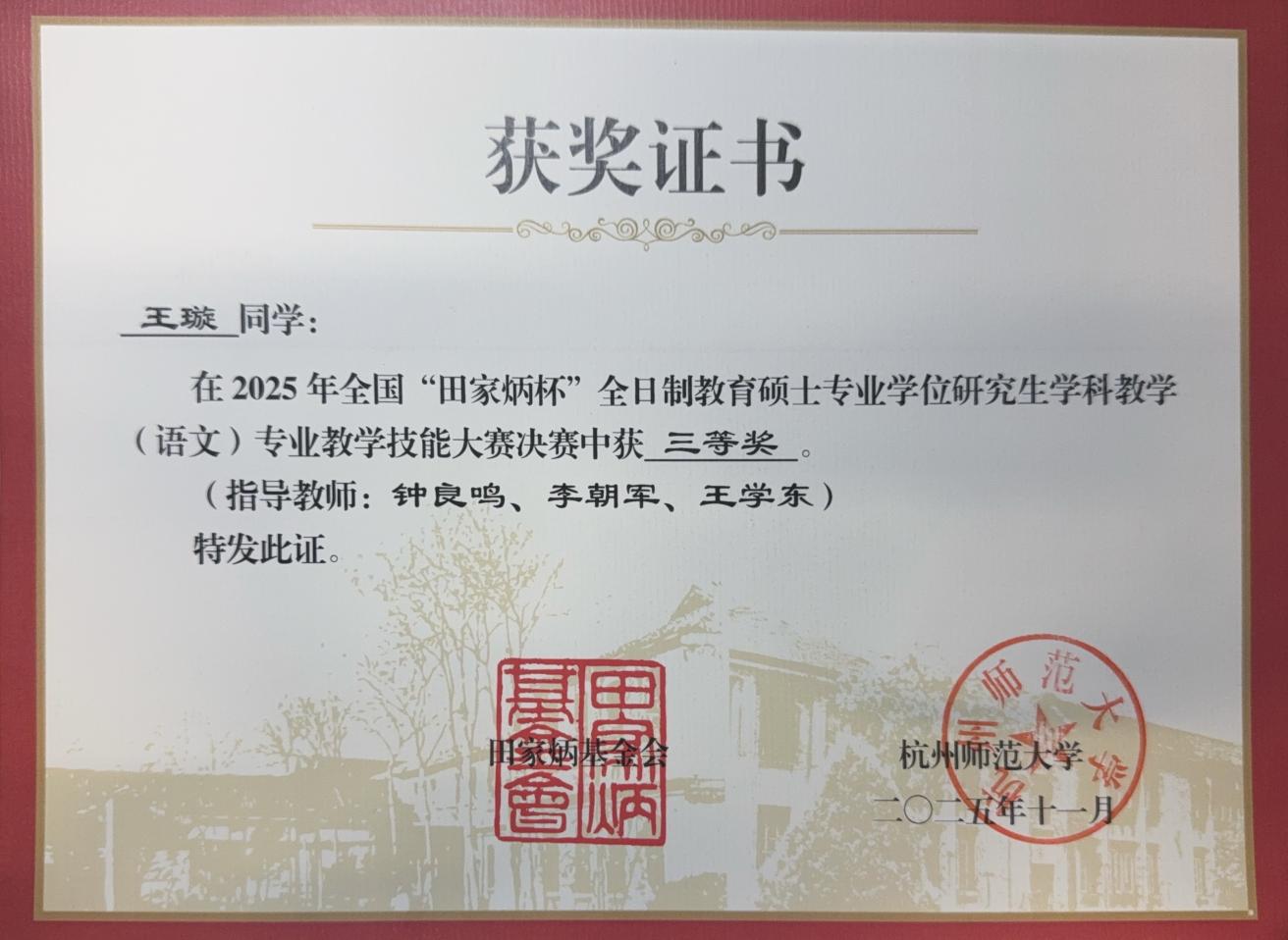 本次大赛获奖不仅是对王璇同学个人专业能力的充分肯定,更是对我院教育硕士培养质量提升的有力印证。长期以来,我院始终秉持“以赛促学、以赛促教、以赛促改”的育人理念,依托优质学科教学资源,通过案例教学、模拟实训、专家指导等多样化培养方式,强化理论与实践的深度融合,全面提升教育专硕研究生的教学实践能力与职业素养。