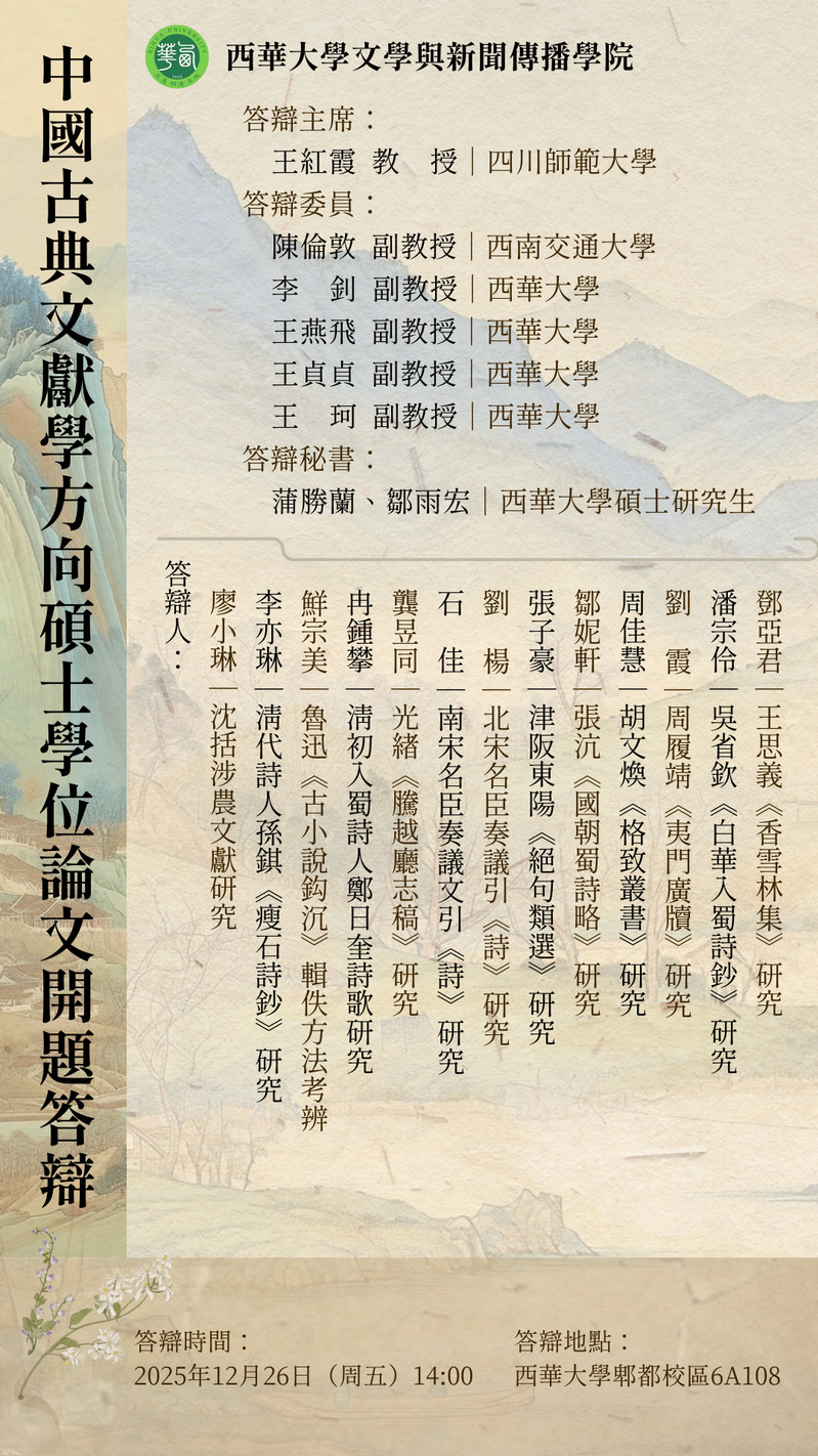 [硕士学位论文开题答辩]中国语言文学专业2024级古典文献学方向硕士学位论文开题答辩