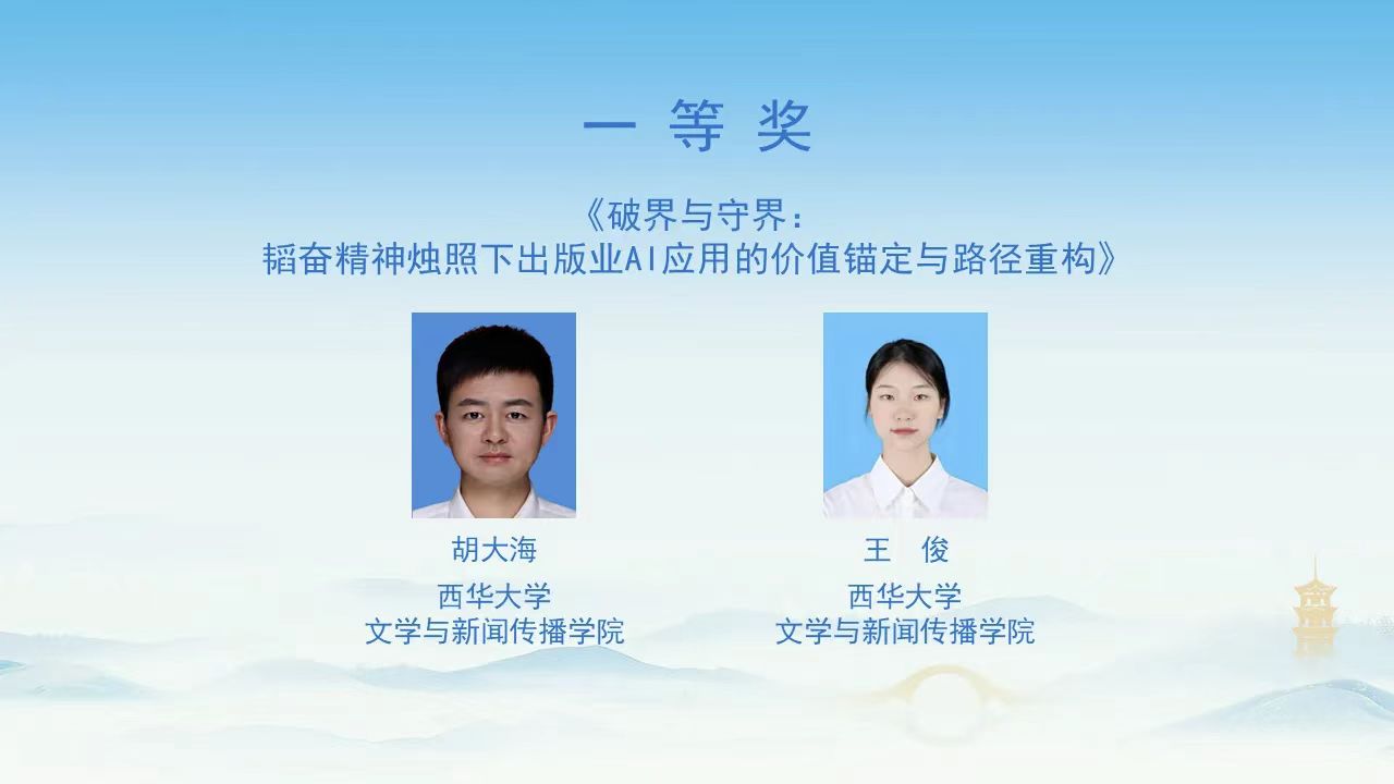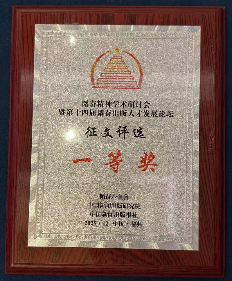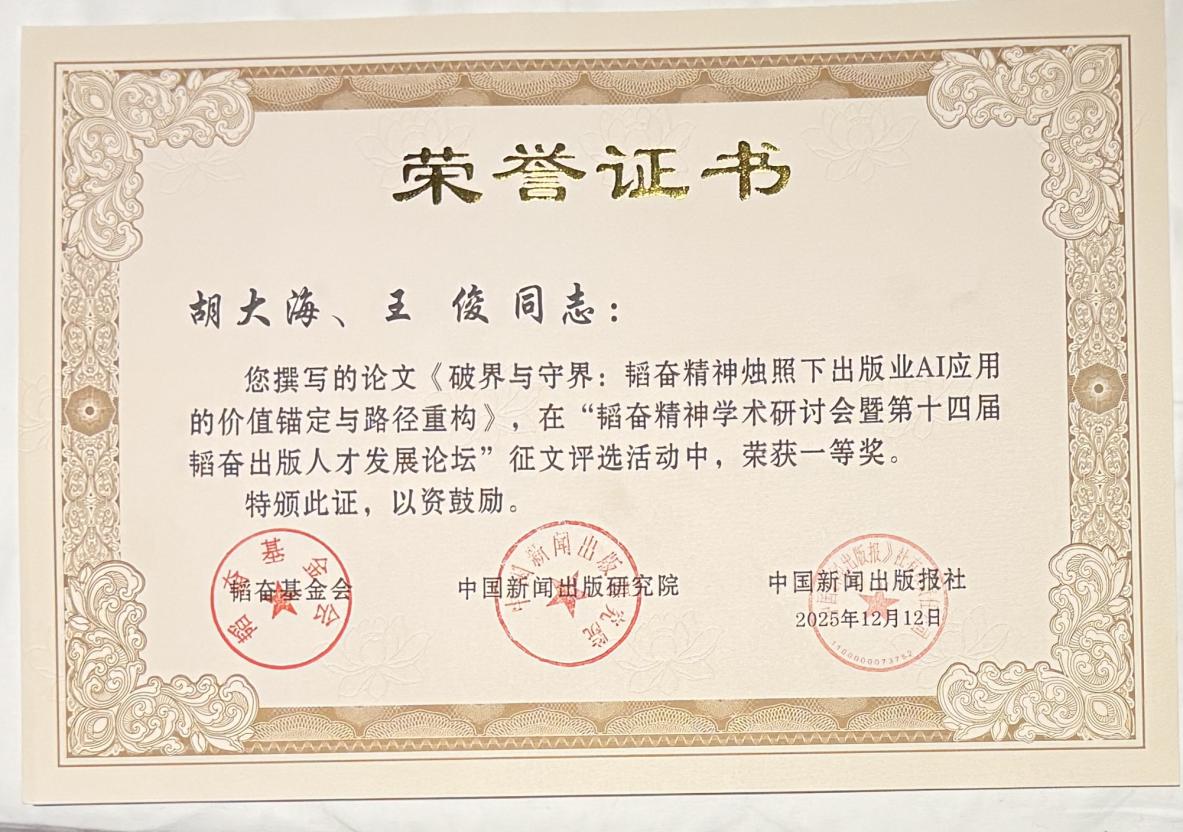 本次活动由韬奋基金会主办,中国新闻出版研究院、中国新闻出版报社联办。就“传承韬奋精神 奋进文化强国”开展交流研讨。我院教师胡大海博士与2025级硕士研究生王俊合著论文《破界与守界:韬奋精神烛照下出版业AI应用的价值锚定与路径重构》荣获学术征文一等奖。